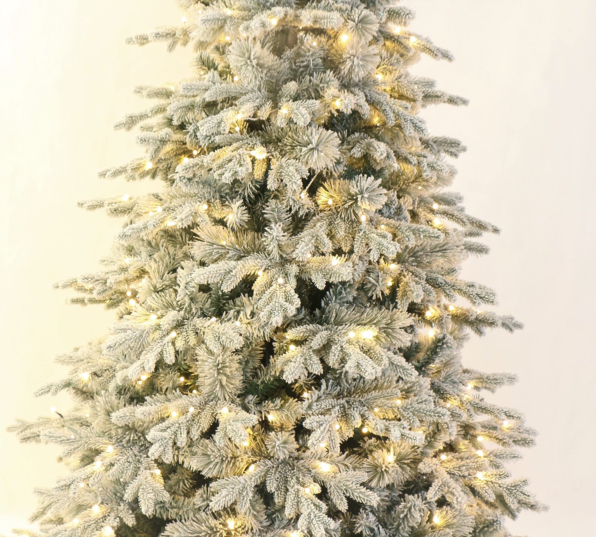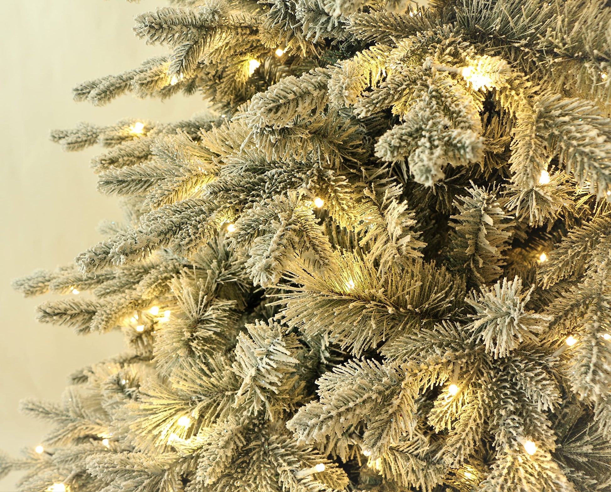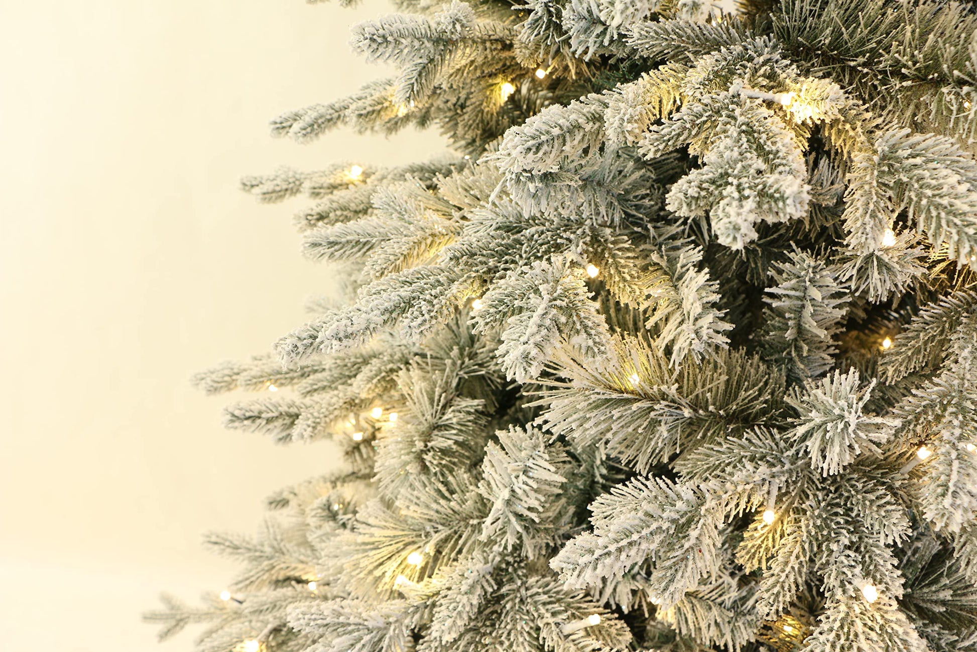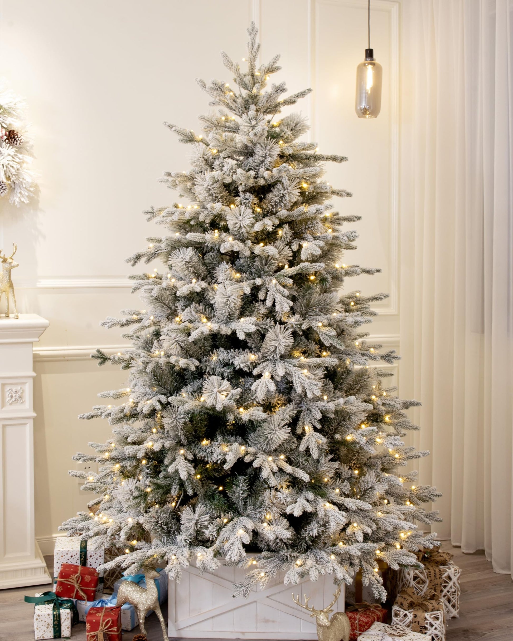 - Pre-lit with 350 warm white LED lights. Ever green branches professionally flocked with fresh looking bright white snow.ed with fresh looking bright white snow.