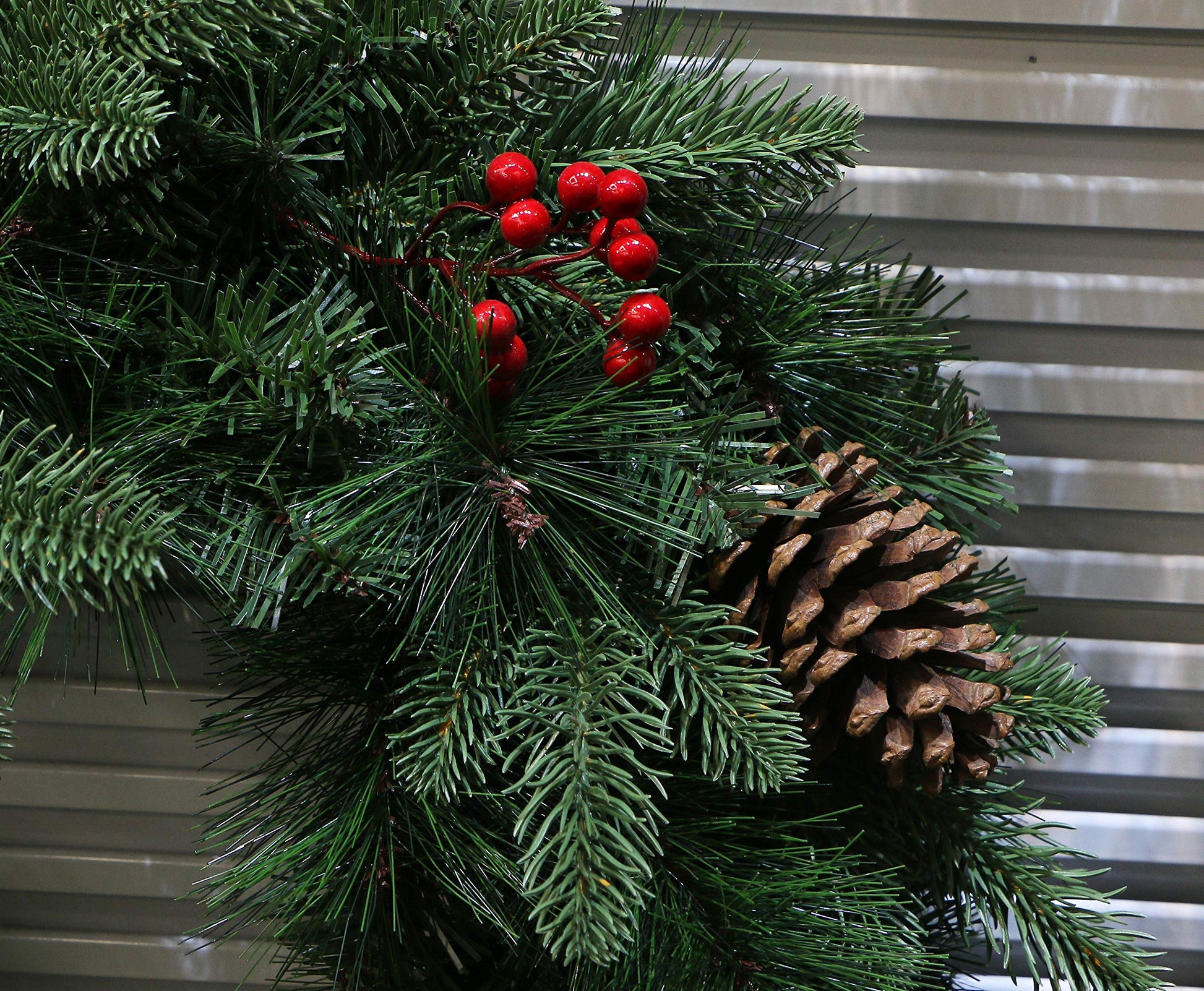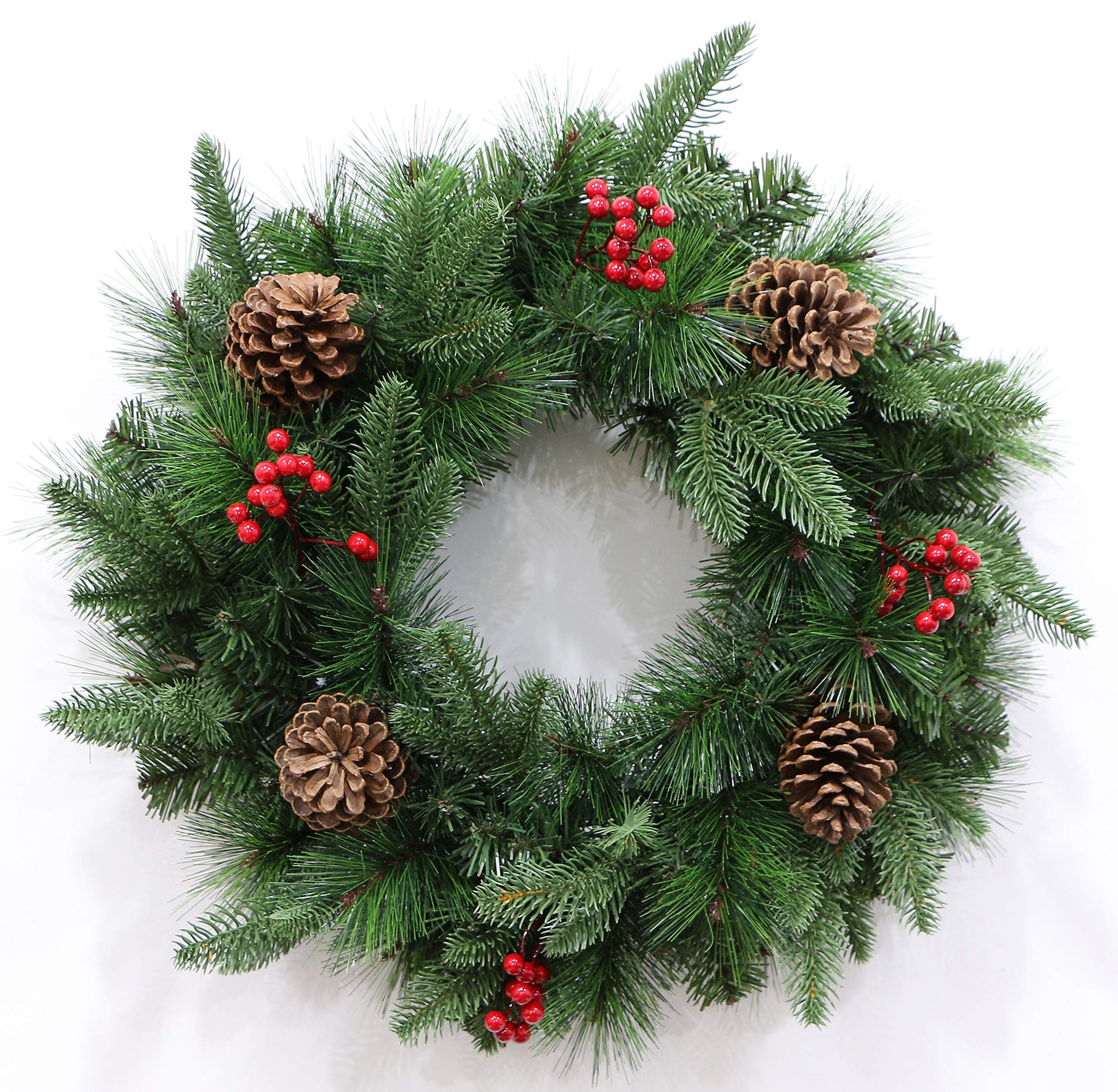 - Made of real feel PE mix pine tips and classic PVC evergreen foliage; decorated with natural pinecones and red berries, naturally beautiful